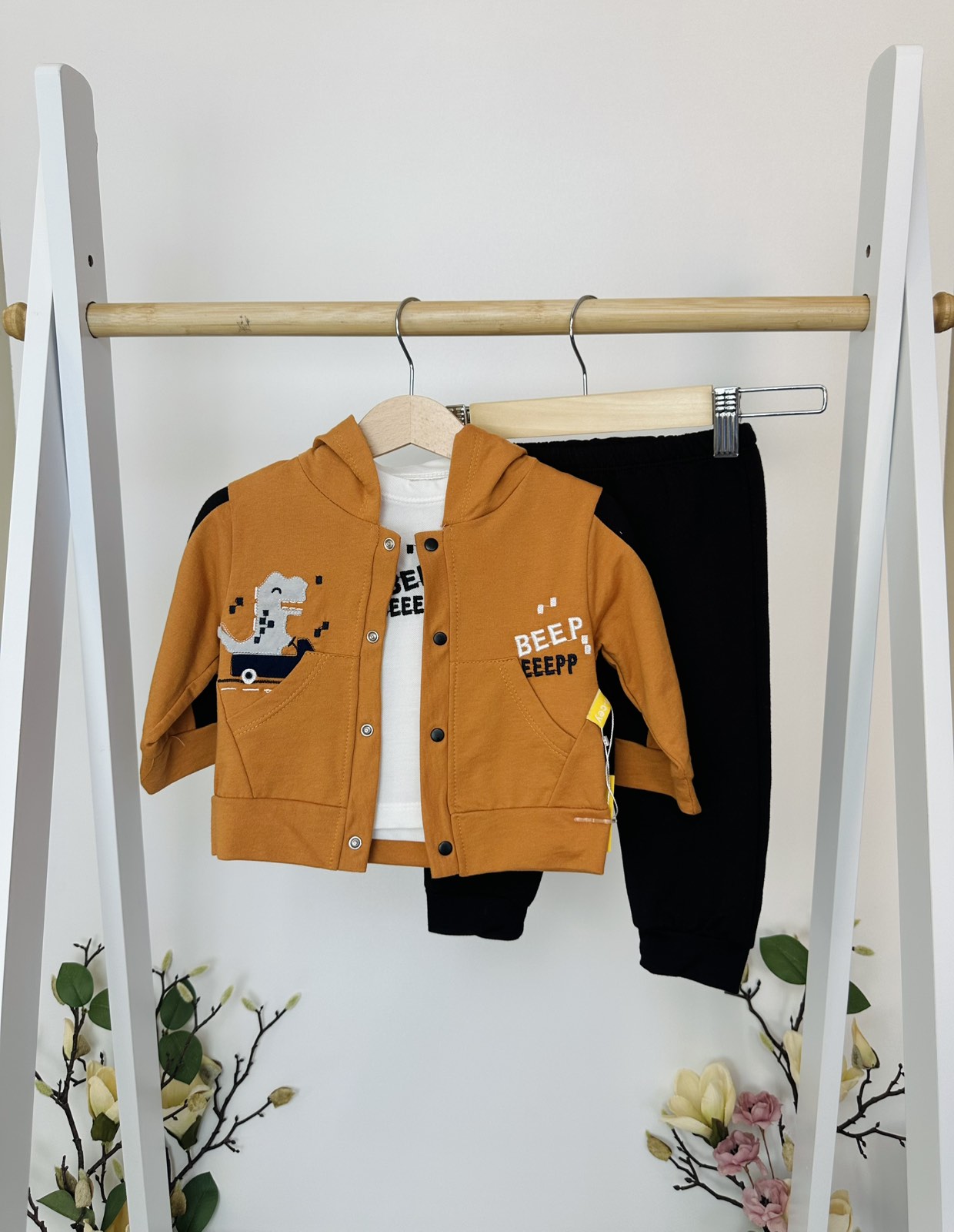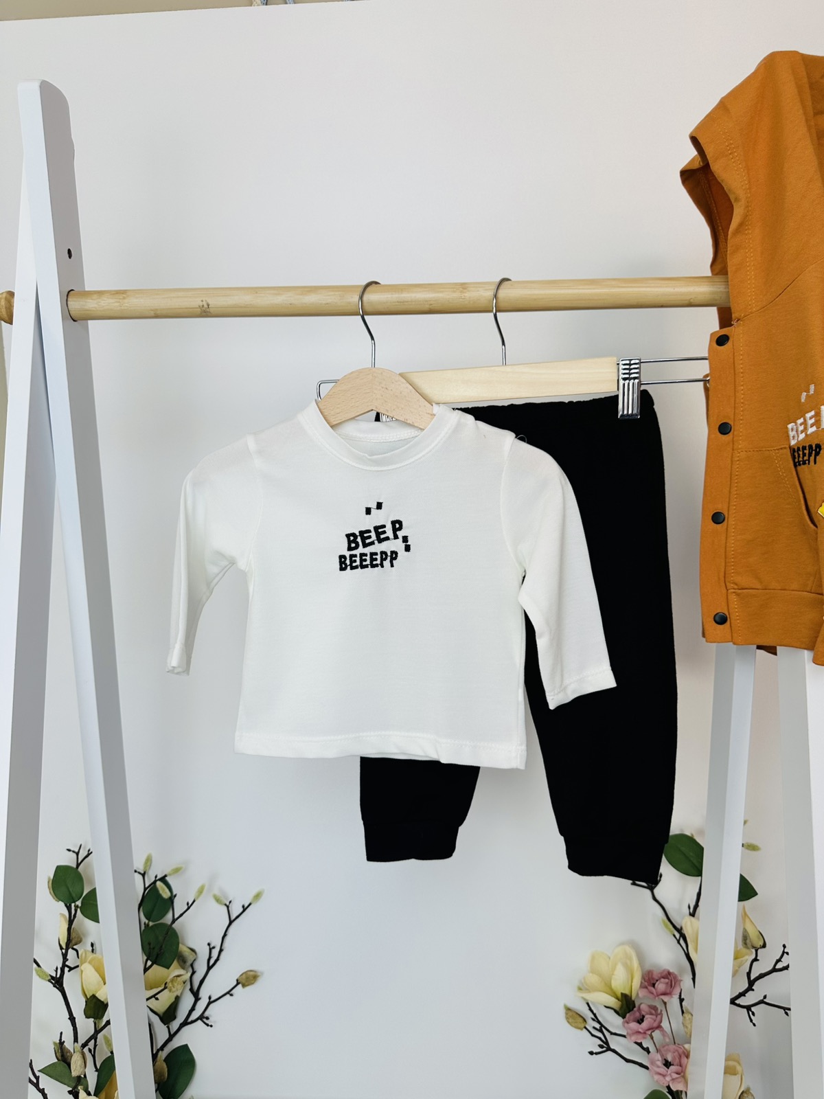 Яркият оранжев суитшърт с качулка и забавни детайли, комбиниран с класическа бяла тениска с надпис „BEEP, BEEP“, създава игрив и модерен вид.