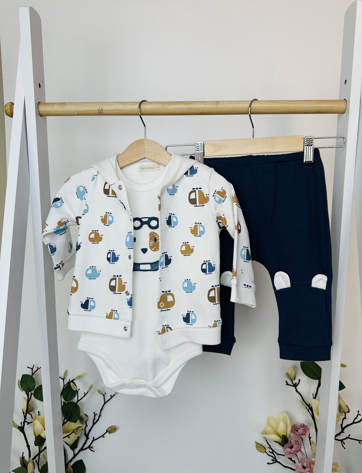 • Суитшърт с качулка – изработен от мека и приятна на допир материя, с весели принтове на хеликоптери в синьо и кафяво. Практичните копчета улесняват обличането, а удобната качулка осигурява топлина в по-хладните дни.
