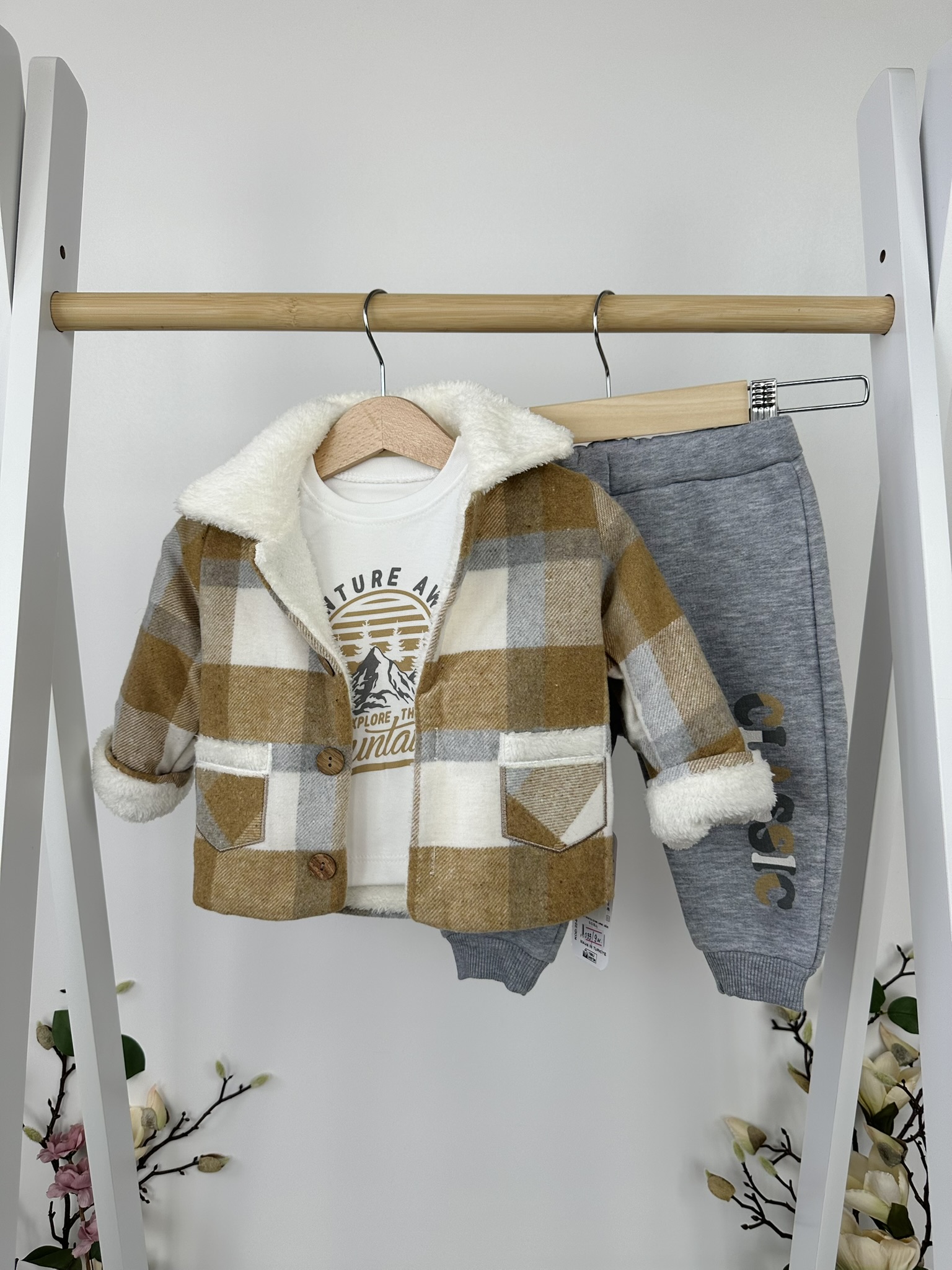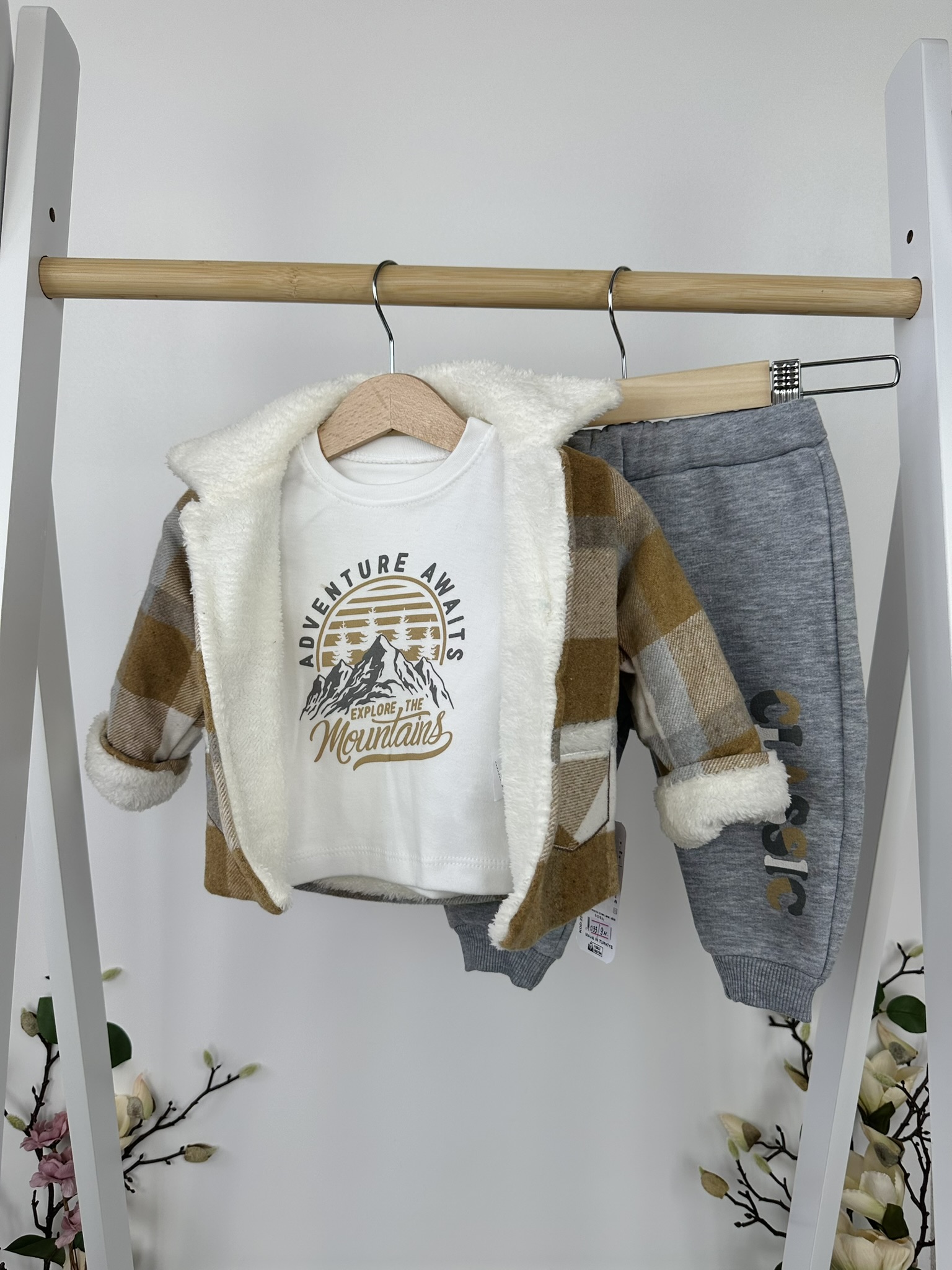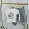 Пренесете детето си в света на стилните приключения с този уютен комплект от три части.