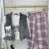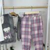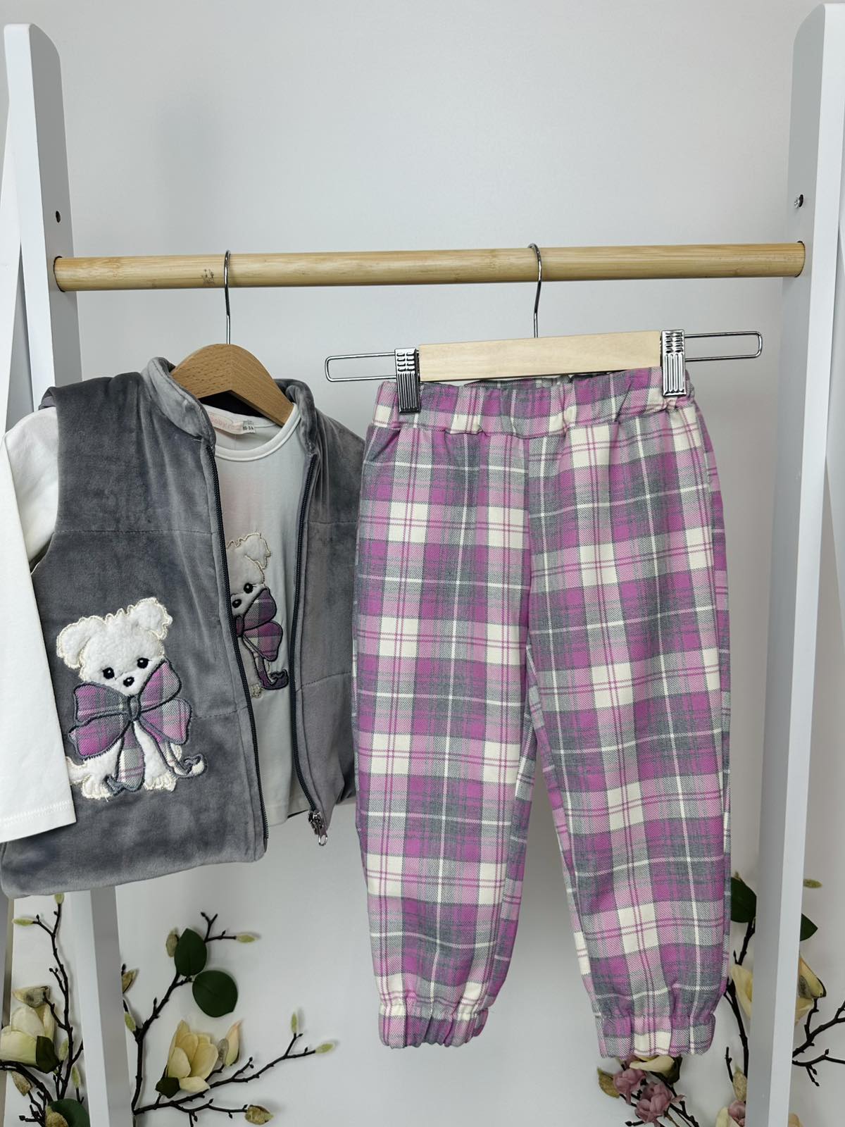 Този очарователен комплект е създаден за малките принцеси, които обичат комфорта и сладките детайли. Състои се от три части – мека блузка с дълъг ръкав, елегантен сив елек с плюшен ефект и ефектна апликация на кученце с панделка, и удобни каре панталонки с ластични маншети.