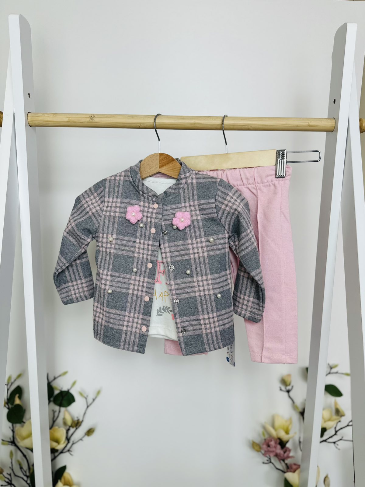 ✨ Детайли: палтенце в каре с декоративни перли и цветчета, мека блузка с позитивен принт, удобен панталон с ластик Елегантност и комфорт в един комплект – идеален за малки госпожици с усет към модата!