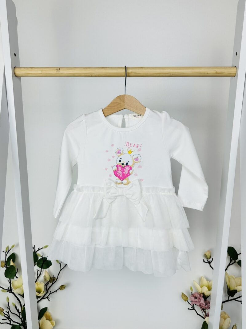 Приказна рокля за малките дами, които обожават да изглеждат стилно! С нежен тюл и сладък принт на мече, тази рокля е перфектна за специални поводи.