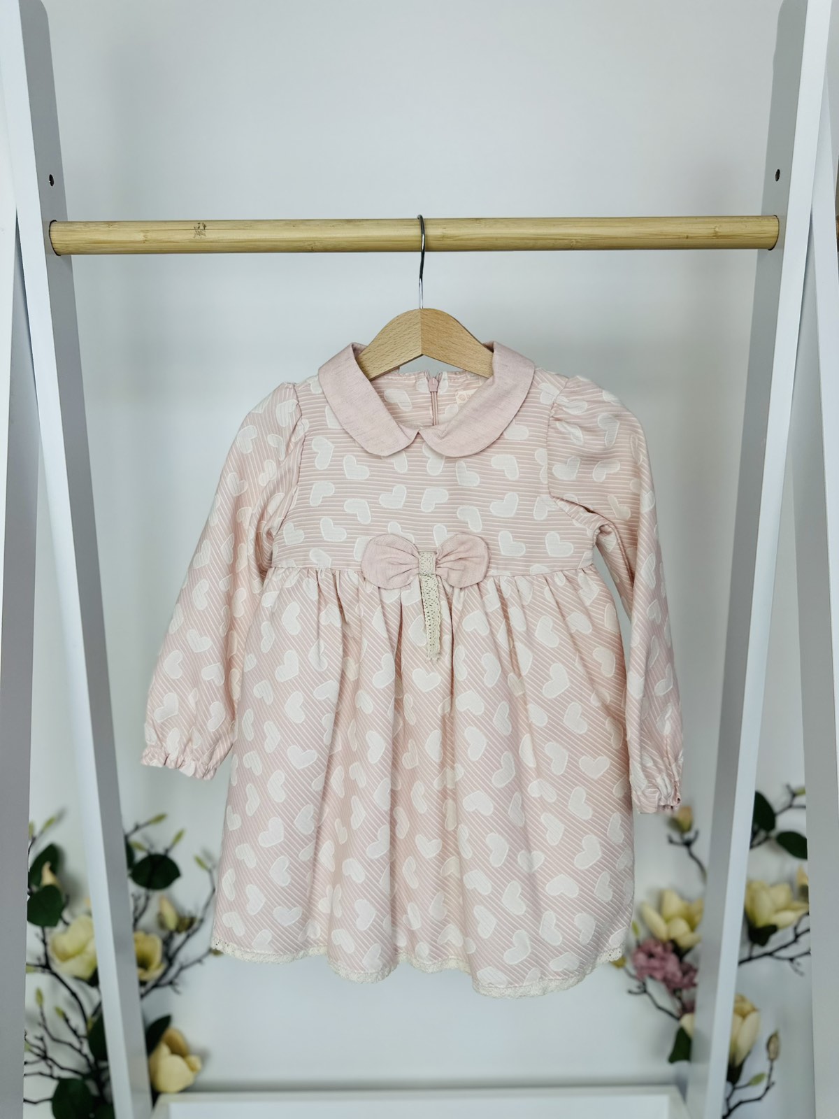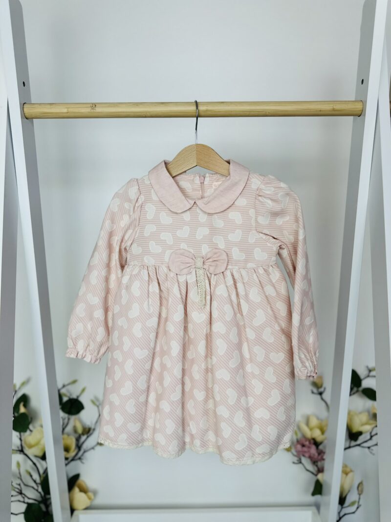 Тази изключително сладка рокличка ще превърне всяко момиченце в малка кукла! Дизайнът ѝ е елегантен и удобен – мека розова материя, обсипана с бели сърчица, нежна якичка и кокетна панделка с фина дантелена лента. Дългите ръкавки осигуряват топлина, а свободната кройка гарантира комфорт през целия ден.
