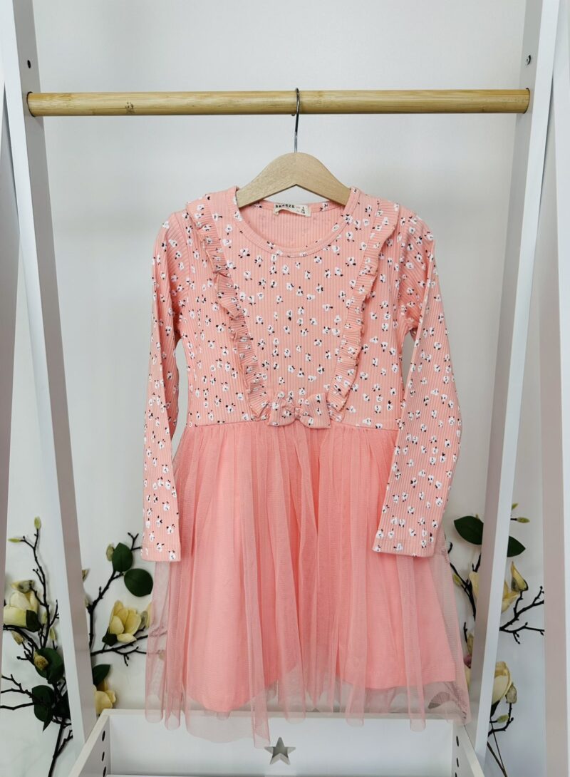 ✨ Защо ще я харесате? Тази рокля е истинско съчетание на комфорт и стил! Горната част е обсипана с малки цветчета, допълнена от ефектни къдрици и елегантна панделка. Тюлената пола в топъл розов нюанс придава приказна лекота, която ще накара всяко момиченце да се почувства като истинска фея.