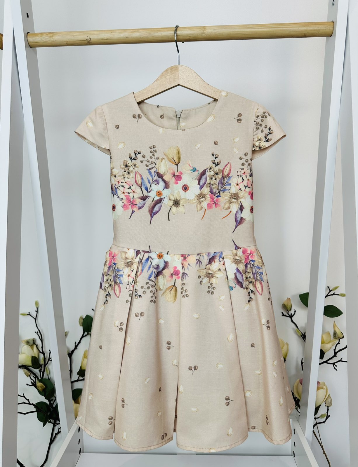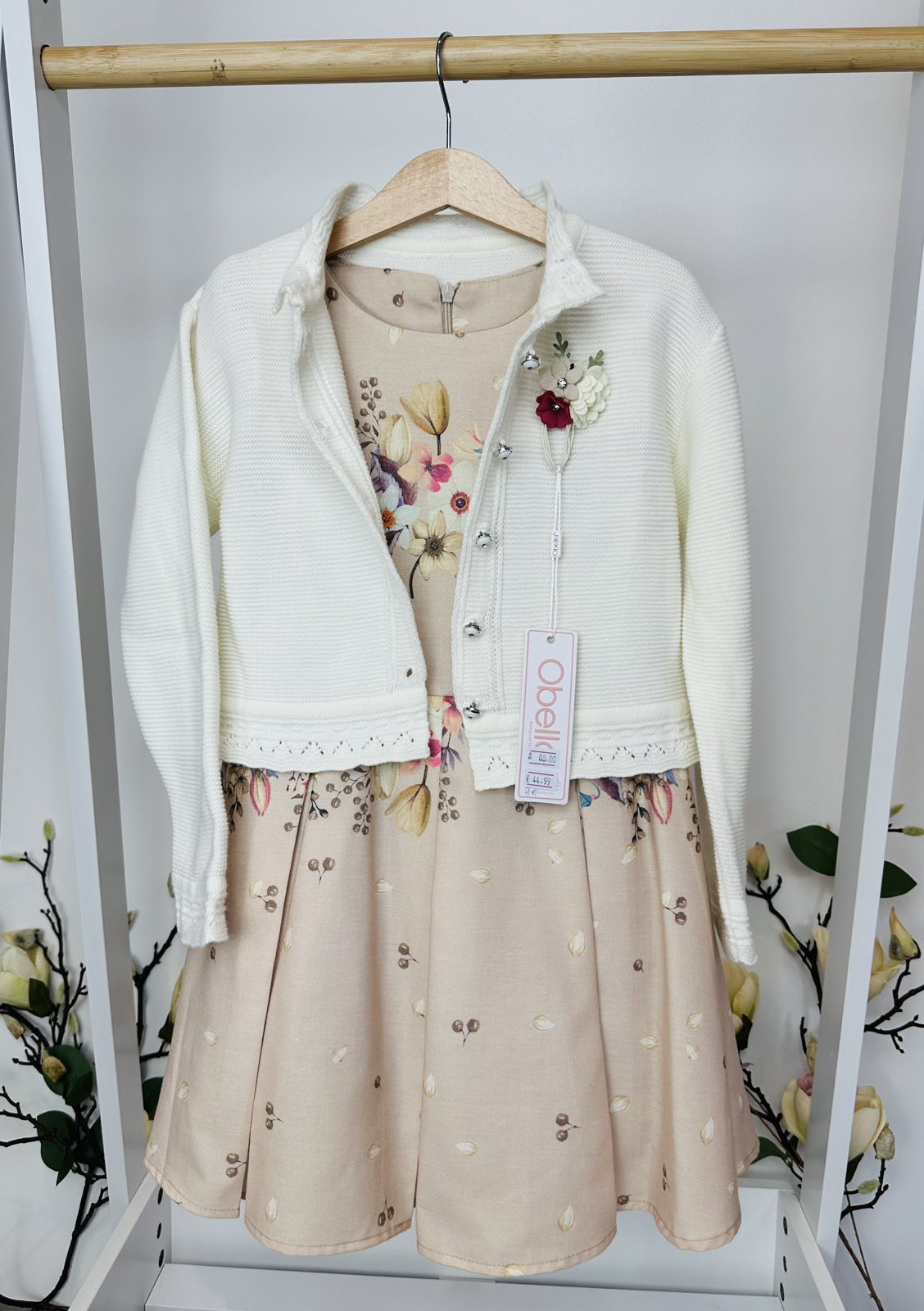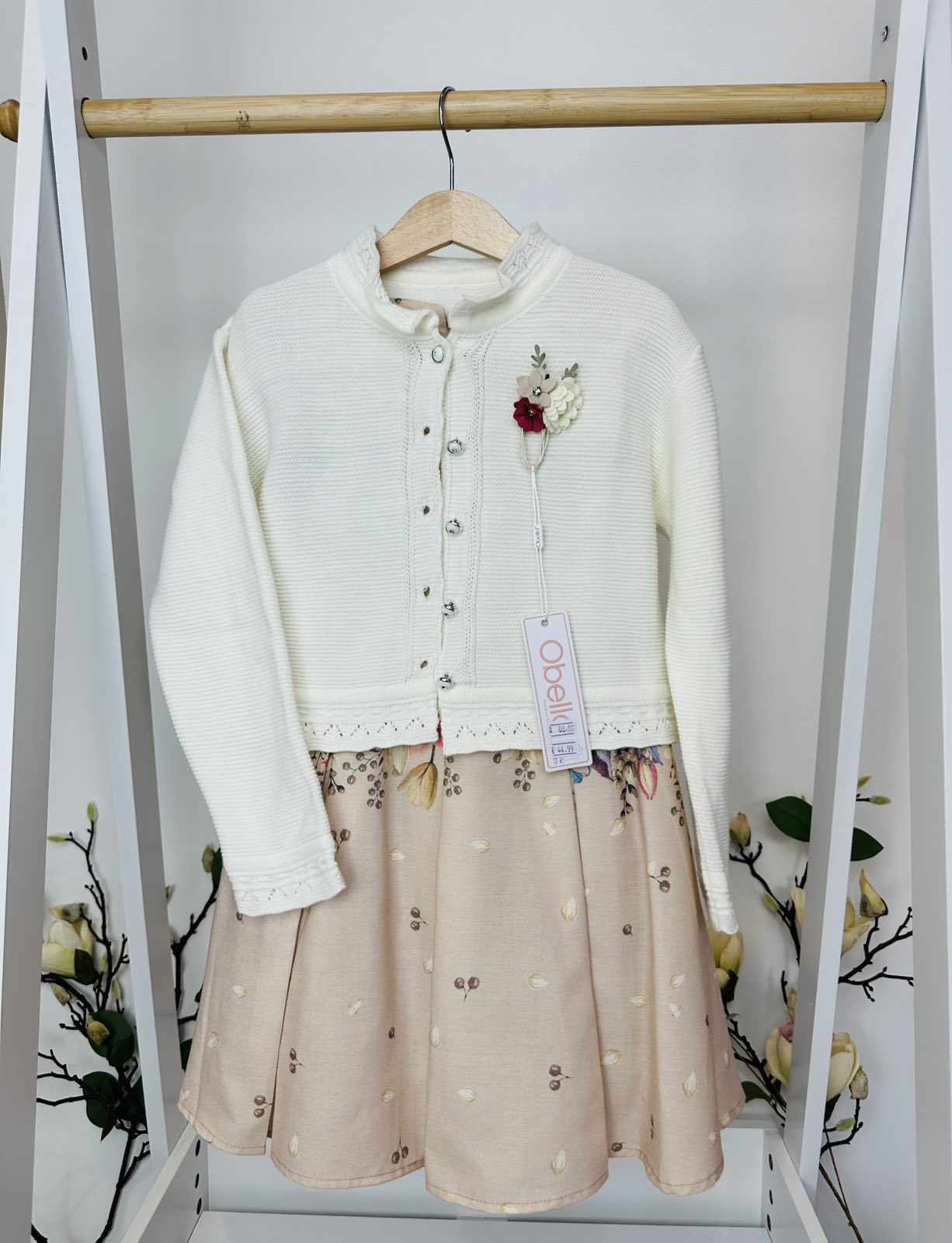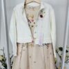 Елегантен флорален десен, съчетан с мека и удобна жилетка в кремаво, украсена с красива цветна брошка. Моделът е едновременно стилен и удобен, идеален за всички специални поводи в живота на вашето дете.