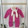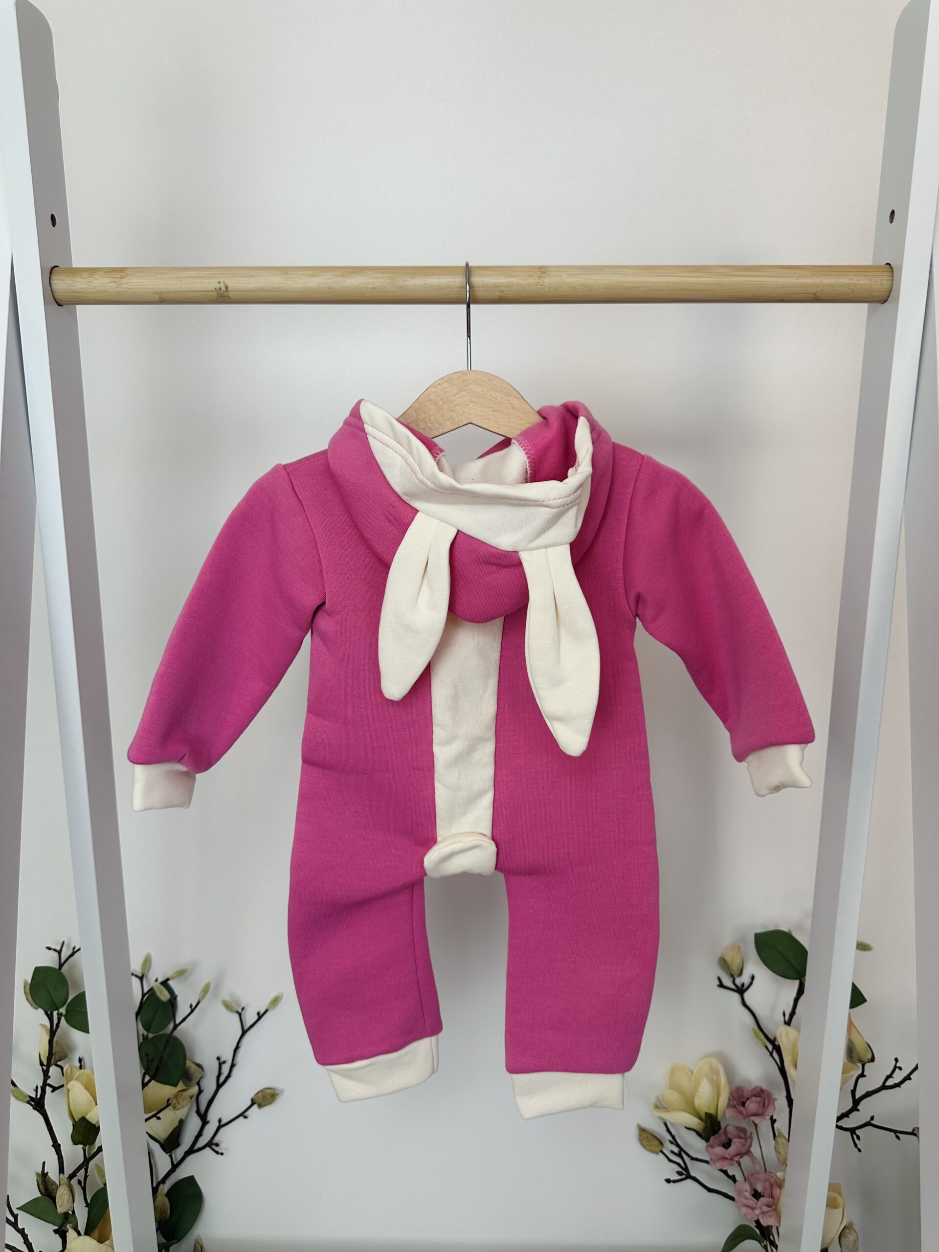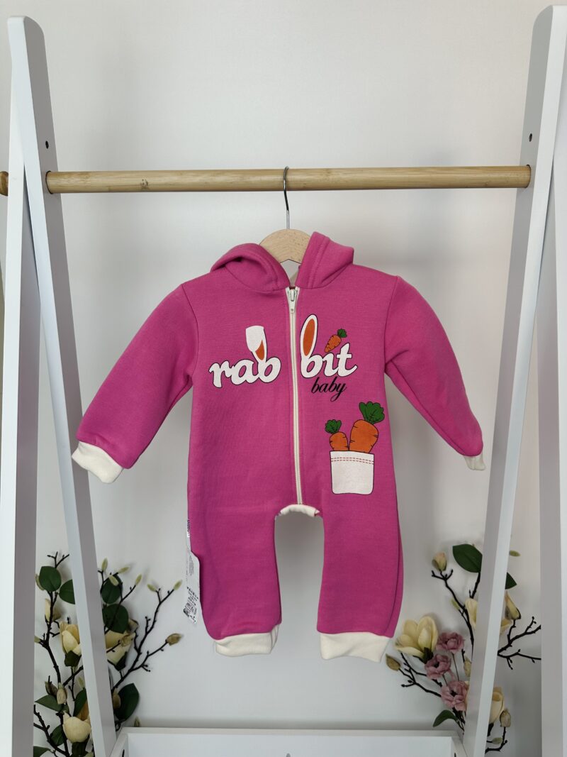 Този розов гащеризон е перфектен за малките принцеси, които обичат топлината и уюта. Дизайнът с зайчешки ушички на качулката и апликация с морковчета прави визията още по-забавна.