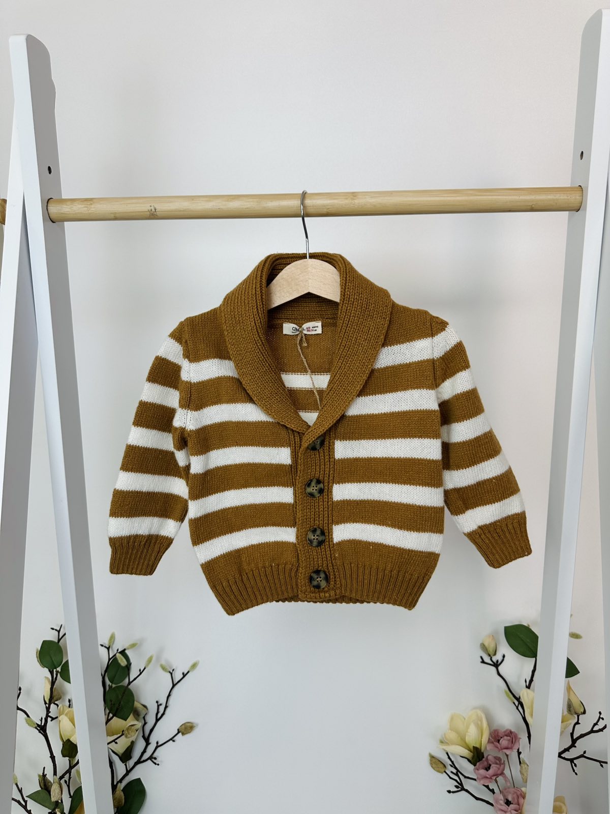 Тази стилна плетена жилетка е перфектният избор за хладните дни. С класически райе дизайн в топли карамелено-кафяви и бели нюанси, тя съчетава комфорт и модерна визия.